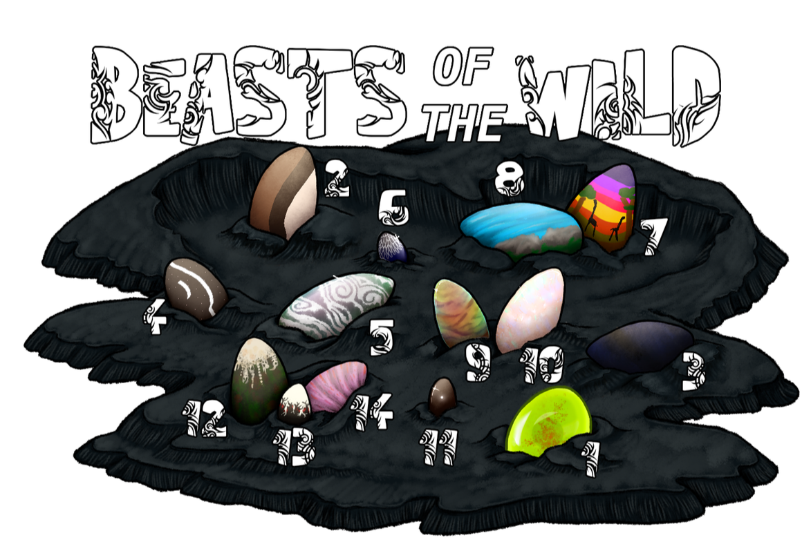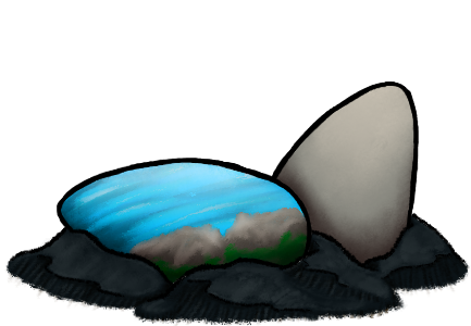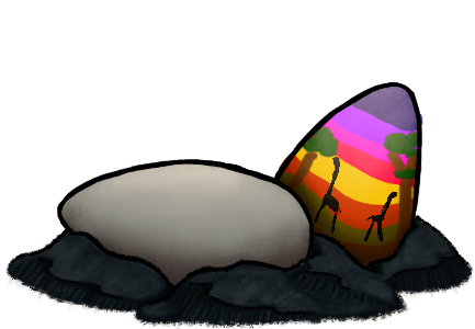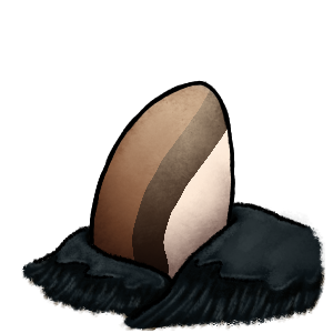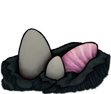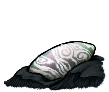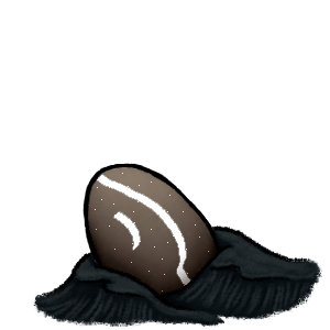 A barely medium-sized egg, this one has been found set to the side compared to the rest of the clutch, its dull coloring making it blend with the walls of the Hatching Cavern. Upon closer inspection, this egg is more oblong than a proper egg shape; its primary grey-brown color and two streaks of white are the only visible from far away. Brown and grey blend together to give it a uniform background. two striking lines of white mark the surface, one going from end to end, the other merely a quick line, as if someone forgot to finish it. Up close one can see there is more to this egg than before; across its whole surface are speckles of pale pink.