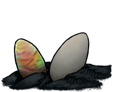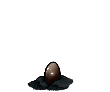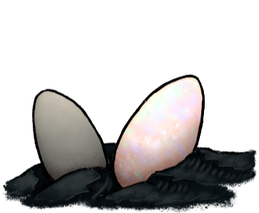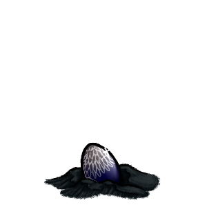 The darkness that covers this egg's surface is shattered by glittering veins of opal that spider through it. Each of these marbled trenches sparkles with a pale, subtle rainbow that shines in sharp contrast to the void it runs through. It rests in the sands as a perfectly broken pearl, small in comparison to its siblings but distinct in its eagerness. From the moments of its laying, it shows a desire to hatch and present its contents to the light of the world. A longing that even the dark depths of its shell cannot hide.