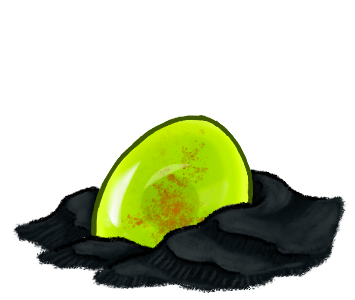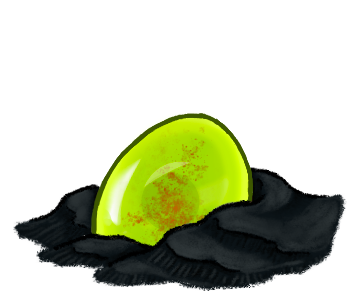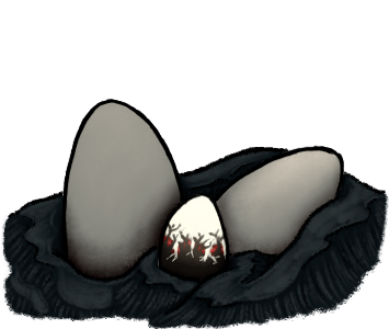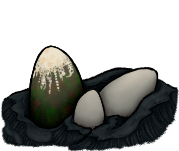 Middling in size, the Primeval Crown sits as the foremost of a cluster of eggs, wedged firmly upright in its heap of sand. Unlike its wiggly immediate companion, it has an immovable air to it, never shifting even a little in its place. The top of the egg is a roughly circular patch, bone-white, that drapes down into curving points and curls. This is the only discernable pattern on a shell so dark green it is almost black, dappled at random with shades of murky pine, sunlit leaves and rusty brown. It is only after lingering long nearby that its presence makes itself known, warningly watchful.