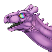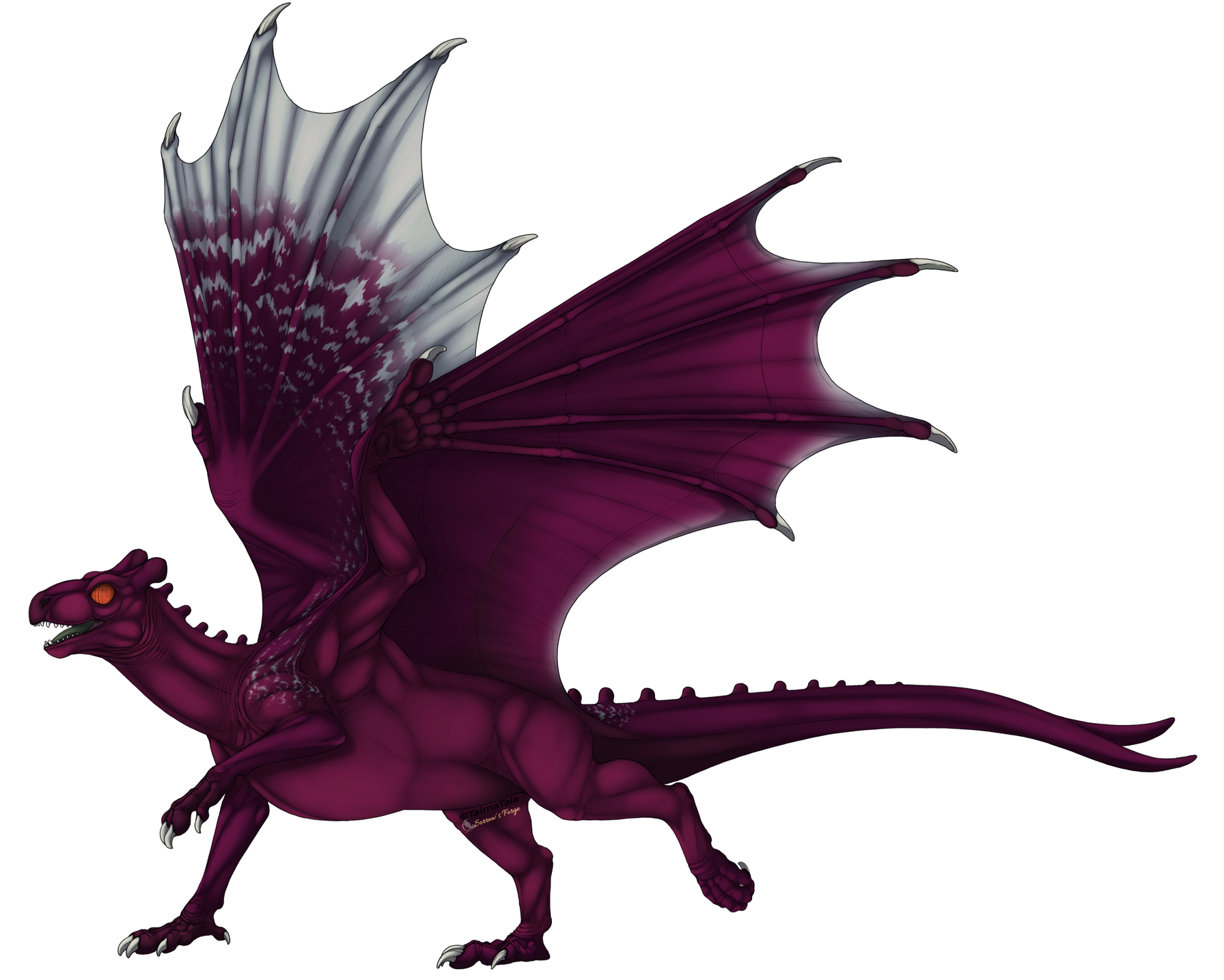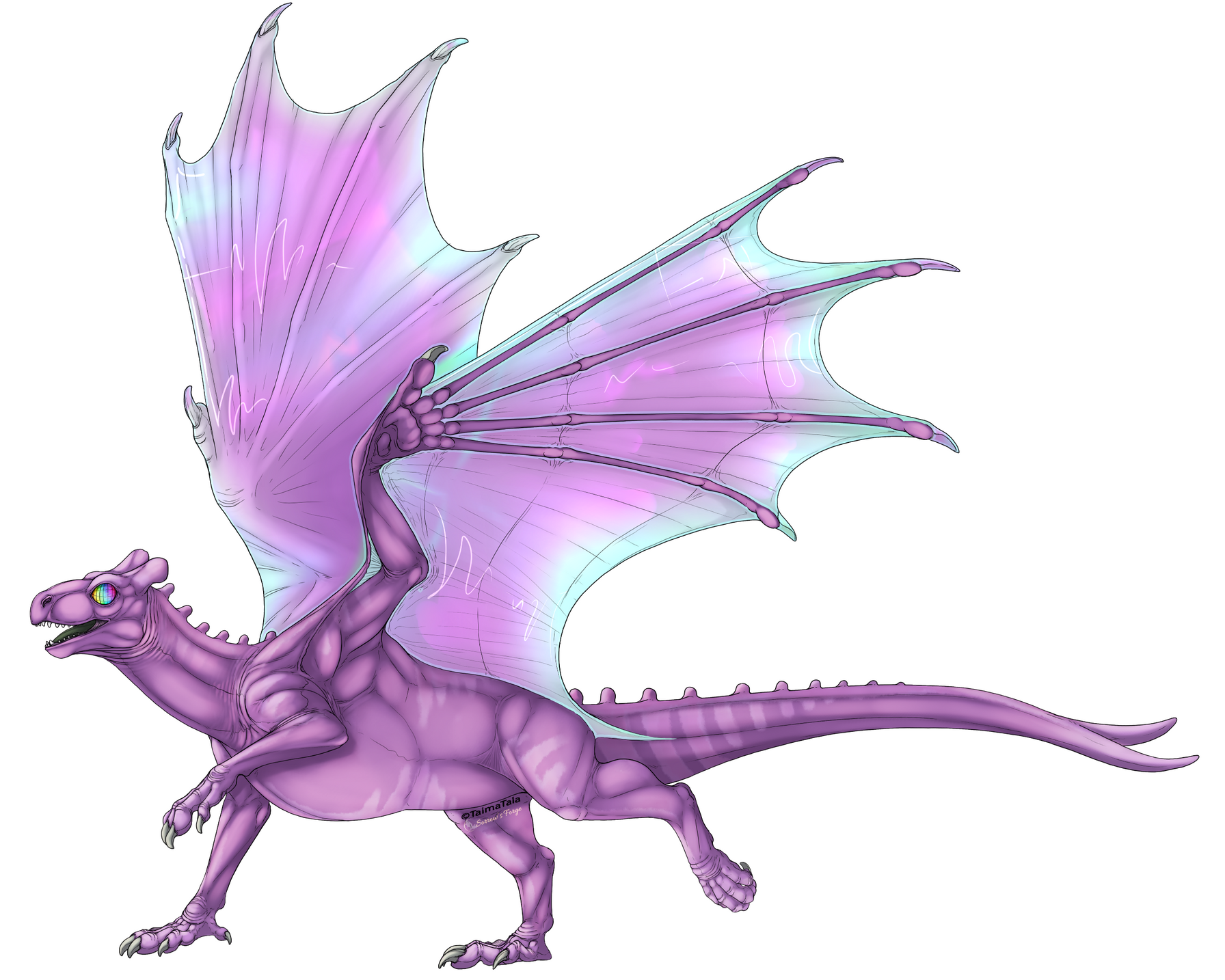 Pereath grows up to be a massive purple, towering over many of his fellow 3rd Caste dragons - as well as some 2nd Caste! He has a deep lilac purple hide with a mid-tone pink tint throughout, and a pair of dazzling, iridescent wings that seem to reflect any light that touches them.Across his body, Pereath also appears to have a series of lighter purple markings - almost resembling skeletal outlines around the top of his neck, his shoulders, down his back and in a parallel spot on his underbelly, on his thighs, and finally, on the base of his tail. His paws, and the end of his tail also appear to almost be ‘misted’ in this same color as well.As well, though Pereath has a somewhat bullish - or, potentially better described as bearish - features, few would call him unattractive. In fact, once he's fully grown, many find his sharp jaw, high head, and broad chest rather handsome. Either way, by almost any account - overall, he's a striking creature.