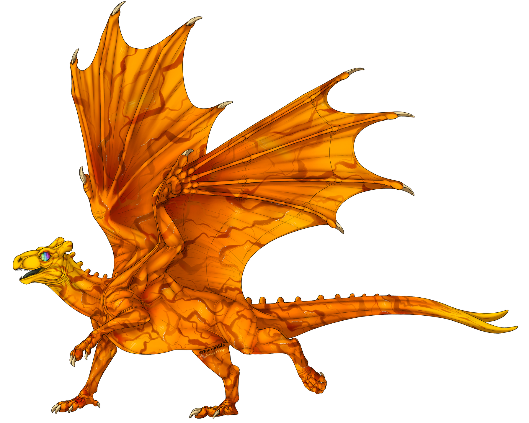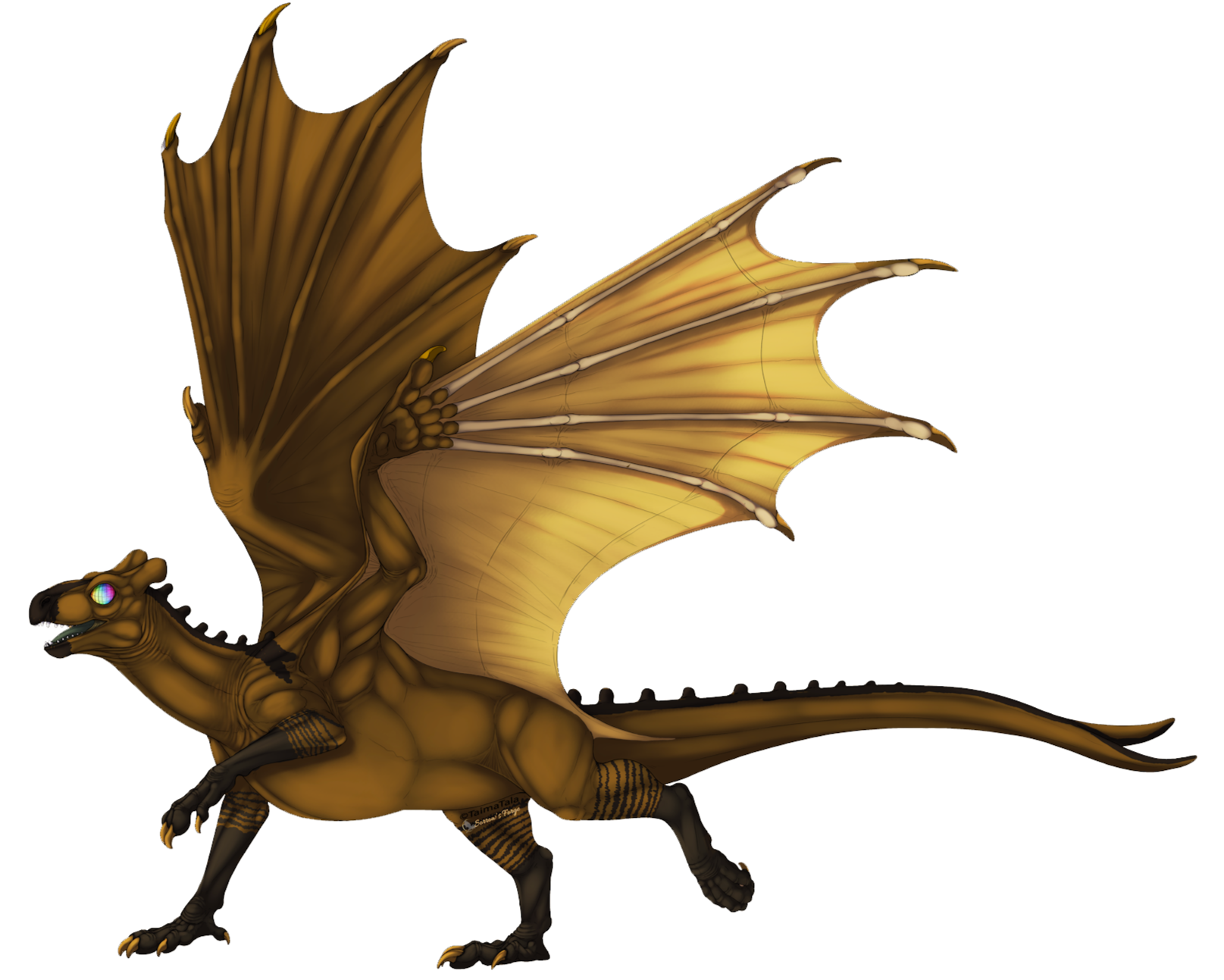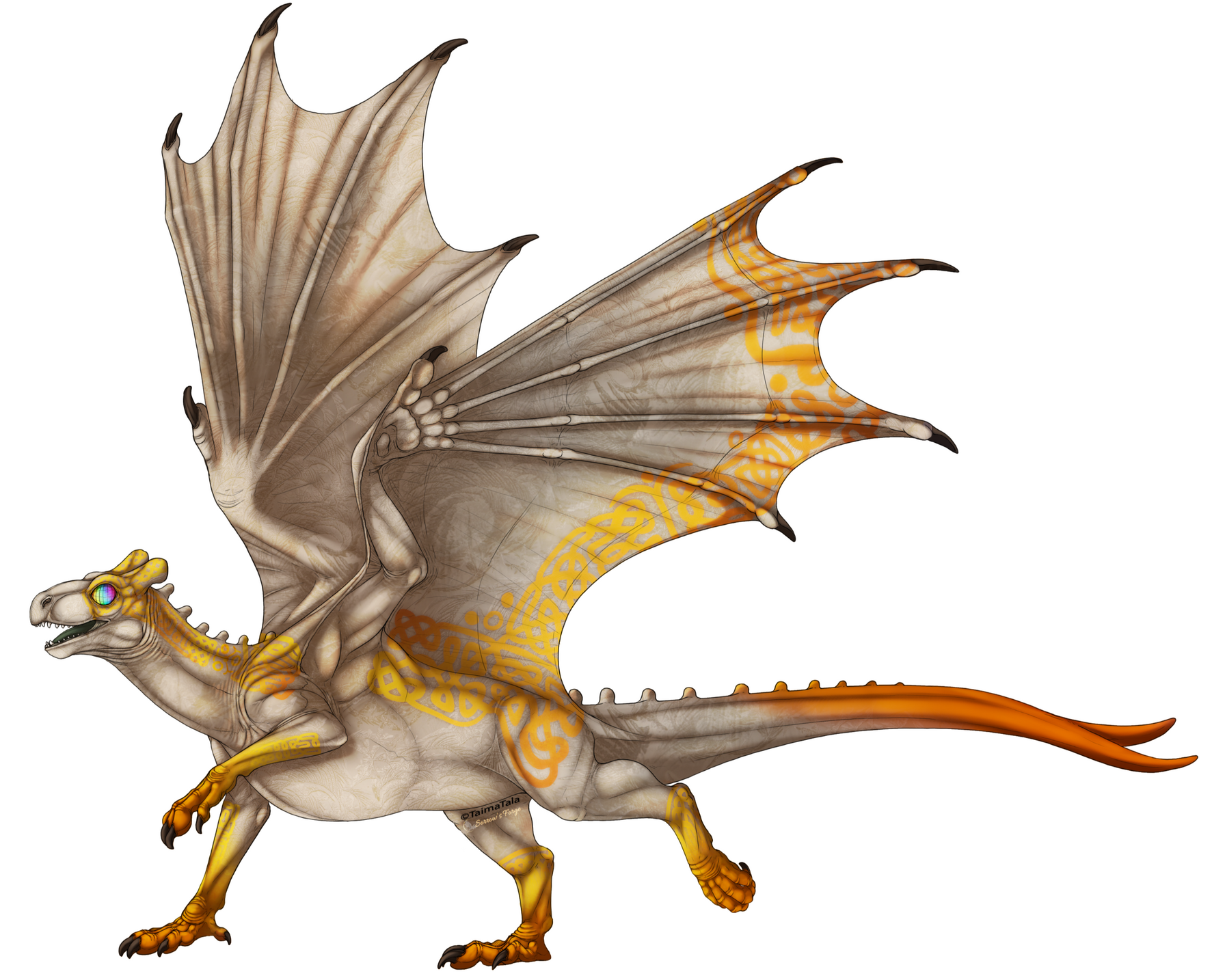 Adrastath is a mountain of a dragon, built so stockily that its impressive length is a distant second impression. Heavy-jawed and broad-shouldered, it radiates physical presence from its huge, wide wings to its long club of a tail. Its legs are long but just as densely muscled, and despite its bulk it can build up terrifying momentum both on land and in the air. Adrastath will never be anything close to agile, especially in flight, nor does it need to be - it is made for power alone, and possesses a regal impassivity to the very idea of being shaken from its course.Its hide is smooth, polished ivory, brightened by intricate knotted patterns of burnished gold covering its headknobs and tangling over Adrastath’s head. More traceries of gold fade in and out on its neck and back, down its limbs and up the edges of its wings, lightening in colour to a pale gleam and loosening into fanciful swoops and curls. Its tail is dipped in ruddy copper, rich and bright at the tips and growing wispy and faint until it melds back into ivory once more.