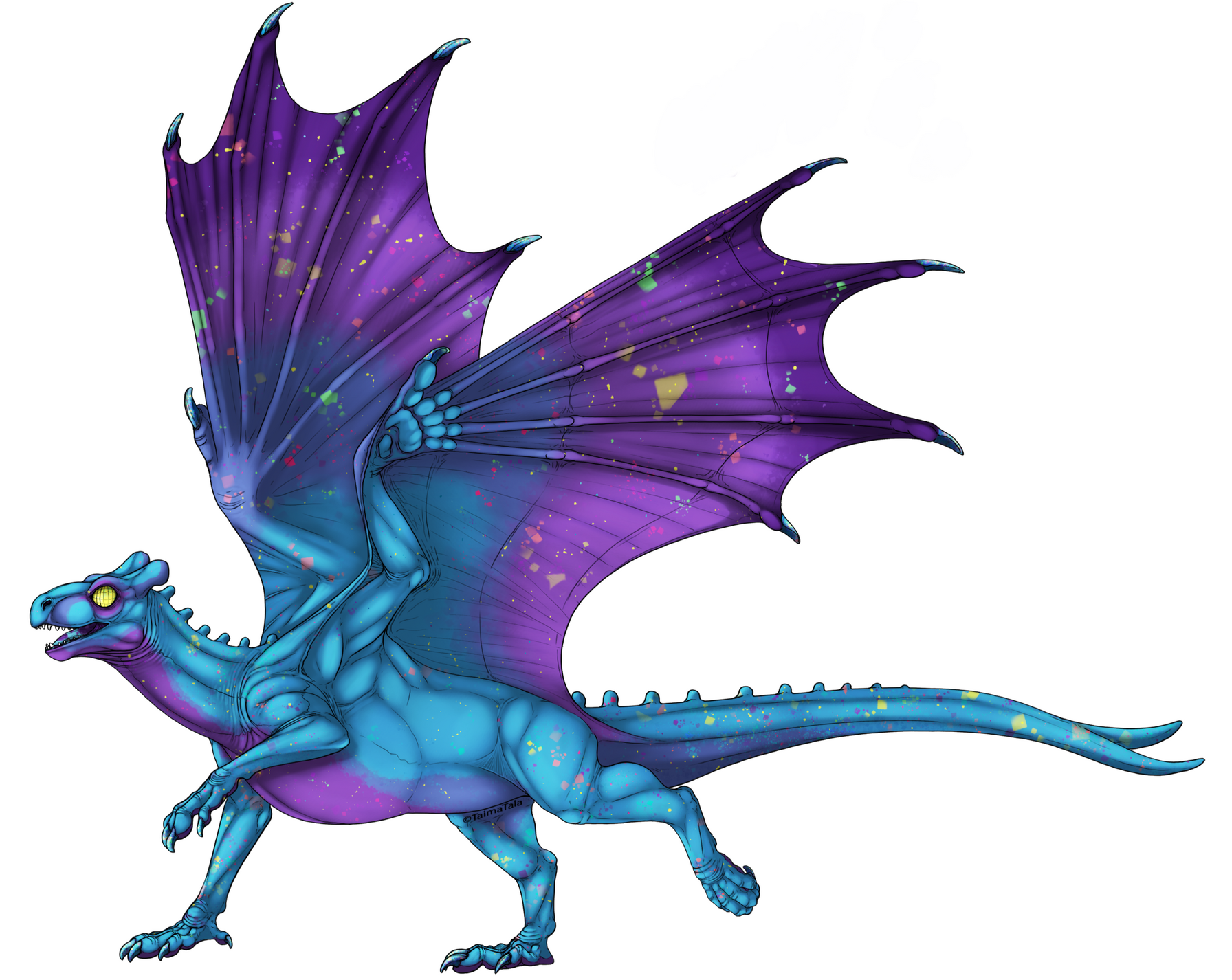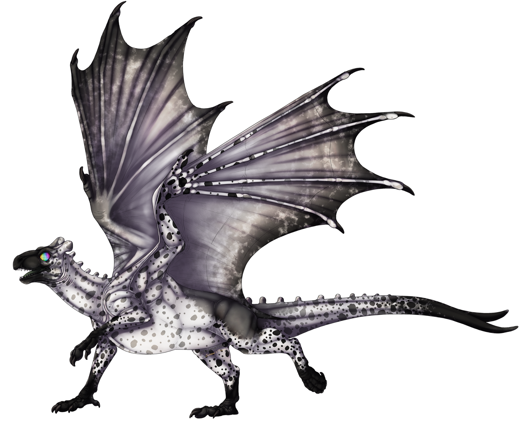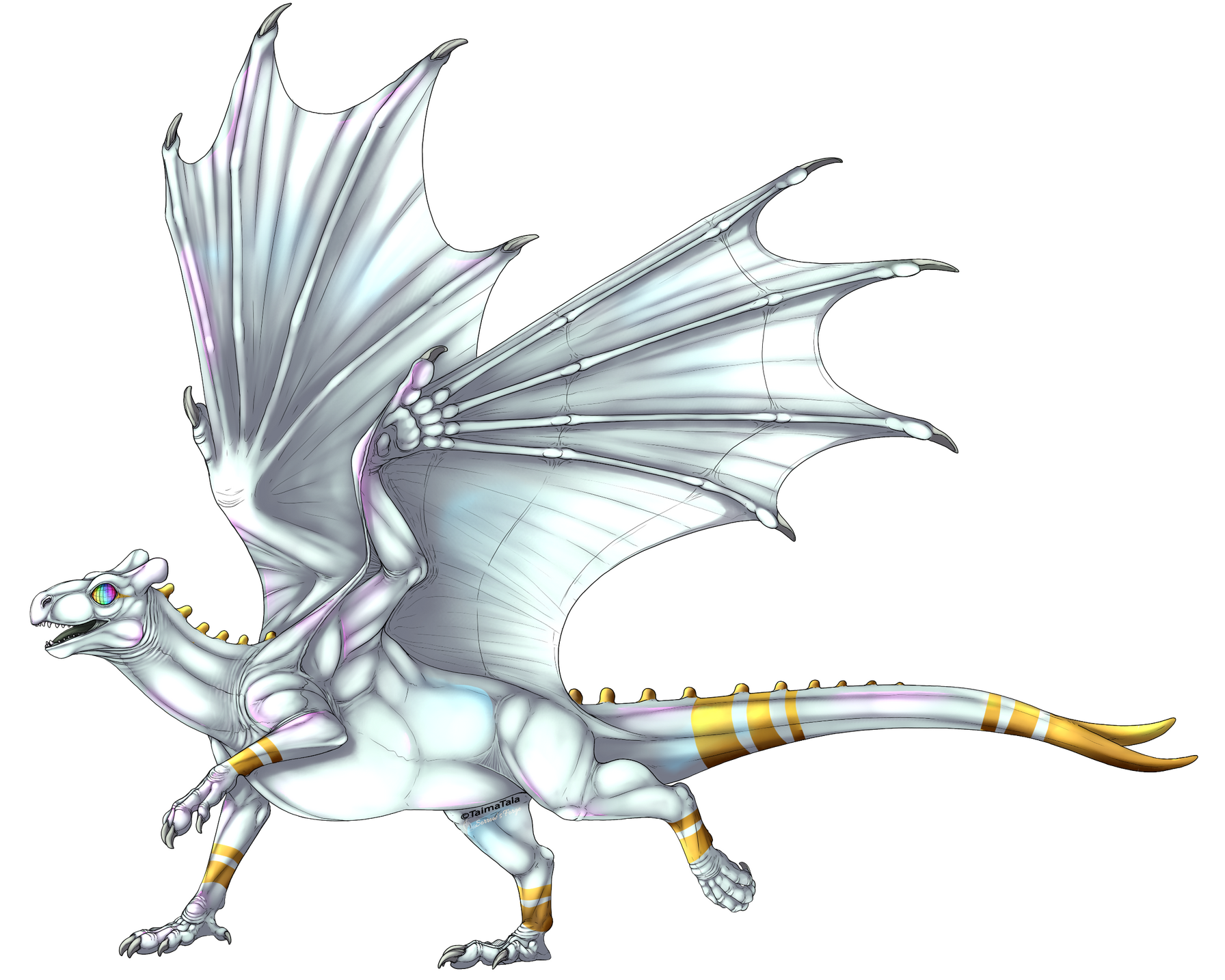 Valkyrith finds a powerful and delicate line between beast and beauty, defined by sharp features blending seamlessly into smooth ones - she catches eyes from friend and foe.Her truly opal hide seems to reflect light almost like a mirror to the sun, her color tinted so brightly you might hardly be able to tell with a passing glance that she wasn't a white if it weren't for her size. That is - until the light caught her. Even the tiniest refractions of illumination seem to paint her form in shimmering blues and pinks and greens, a hypnotic swirling pattern that at times can threaten to (at least secretly) dazzle some of the most stiff-lipped traditionalists.Notably, though, Valkyrith also appears to have several ‘bands’ of gold markings, two on her legs, just above her paws (one thicker, one thinner), three at the base of her tail (in increasing size), and two at the end of her tail (one slightly larger). The end of her tail, and the spikes down her back are this same, dazzling gold color - one reminiscent of her clutchmother's.Her form is no different - though she may not be the largest Opal to ever roam Pern, she's a force of nature by any sane account. Her slender face and blended features create an incredibly captivating air about her, only aided by her confident disposition. Her shoulders and chest are powerful, and broad, sliding smoothly back into her (notably slimmer) haunches and rump, making her a rather forward heavy creature. Her wings match the proportion though, and sprawl outwards endlessly into the night once she's fully grown.