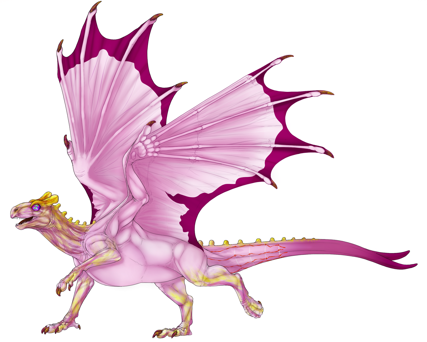 The majority of this dragon's distinctive color features are located in her extremities. Swatches of dandelion and fuchsia trail down this dragon's neck and limbs, conjuring a fur-like image on her smooth hide. Petals unfurl over her wings, fading from darker shades of pink to near white. Magenta coats the jagged edges of her sails and adds to the delicate illusion. A sprinkle of pollen trails down her spine, and though it also coats her headknobs, in that location it only serves as a backdrop for wisps of orange wrapping around both structures. That same, orange-red hue, lends itself to the base of her tail and when paired with white lines, creates a segmented appearance.